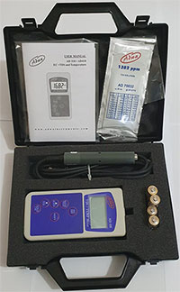 AD1230B pH electrode with Epoxy body, BNC connector and 1 m cable, AD7662 stainless steel temperature probe, 1 m cable, pH 4.01 and pH 7.01 calibration buffers (20 ml sachet each), , batteries (4 x 1.5V AA alkaline) and instruction manual.